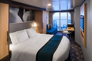 Two twin beds that convert to Royal King, sitting area with sofa, full bathroom and private balcony.
